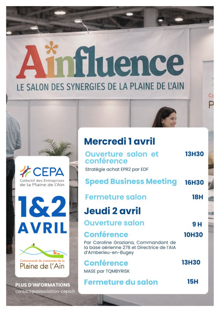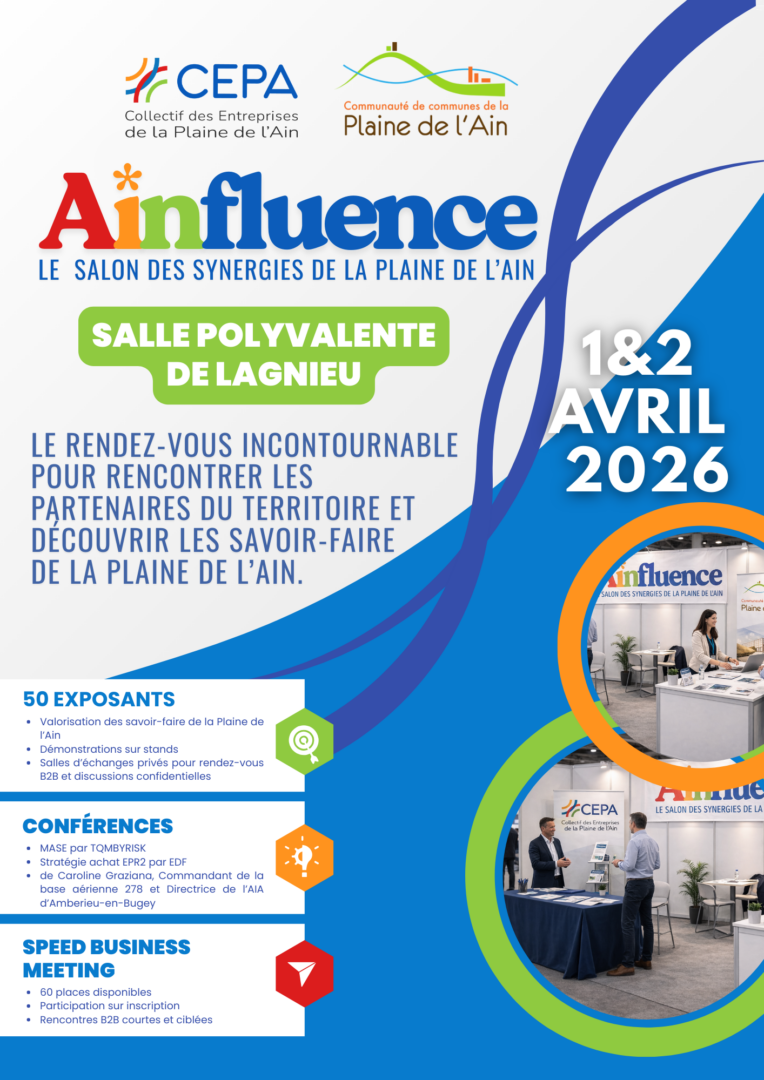 Le salon Ainfluence organisé par le CEPA Collectif des Entreprises de la Plaine de l’Ain et la Communauté de communes de la Plaine de l’Ain arrive à Lagnieu, avec un programme pensé pour favoriser les échanges, les rencontres et les opportunités business sur le territoire.